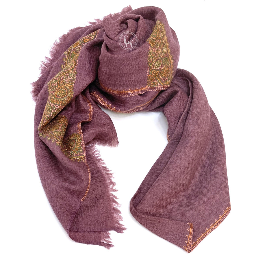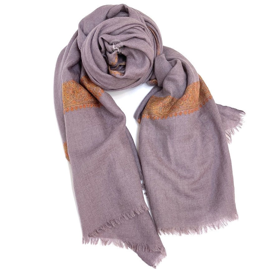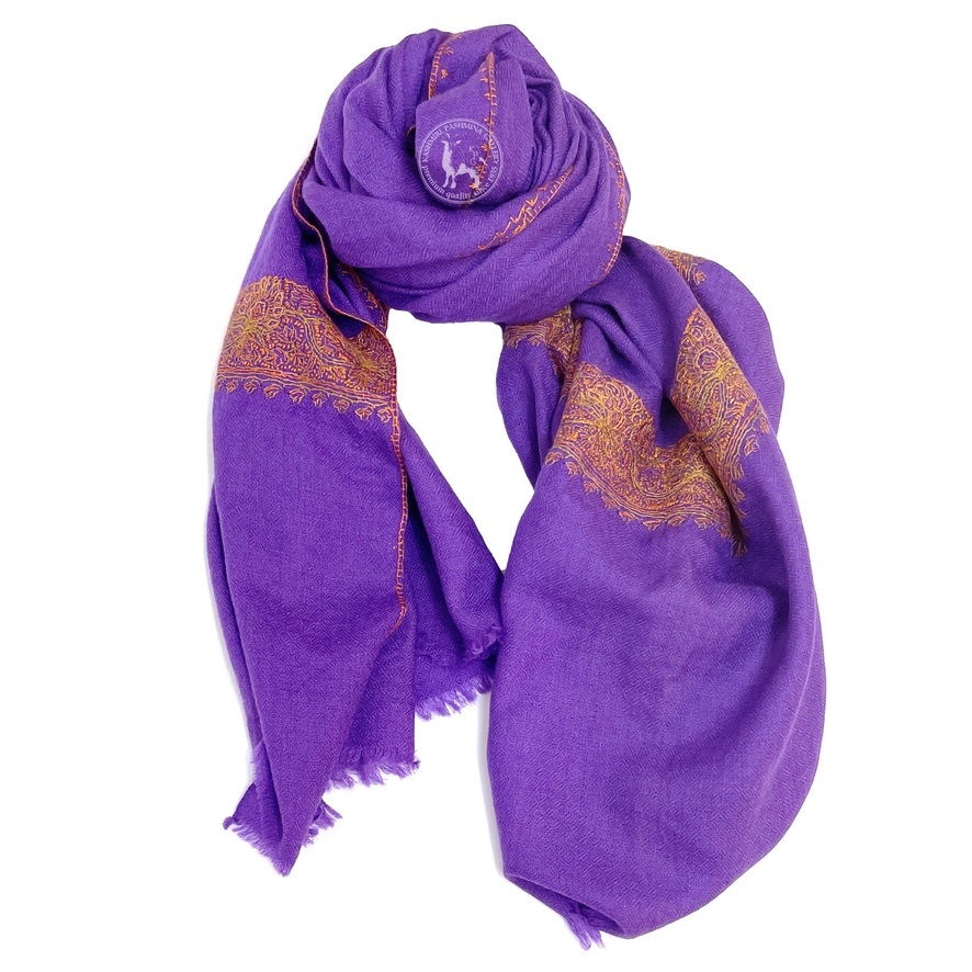 這款紫色索茲尼邊緣刺繡羊絨披肩圍巾採用優質羊絨精製而成,這些山羊棲息在海拔3600至4500公尺的地區。這款圍巾採用如蟬翼般輕薄的材質製成,可以輕鬆穿過環圈,因此也被稱為環絨。絨質越細,編織難度越大。這款奢華的材質不僅觸感柔滑親膚,還擁有卓越的保暖性。從收集相同色絨毛手工捻絨毛到索茲尼刺繡,整個過程耗時數年,技巧精湛。這使得每一條圍巾都彌足珍貴,珍稀難求。工匠們的創造力使每件作品的色彩和刺繡都獨一無二。他們精湛的技藝成就了奢華的刺繡羊絨披肩,使其成為名流的摯愛。這件精美絕倫的作品傳承了百年傳統,堪稱珍藏級珍品。